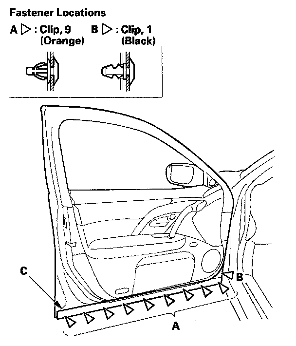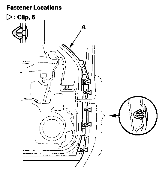 3. Detach the clips, then remove the upper subseal (A) from the front edge of the door.