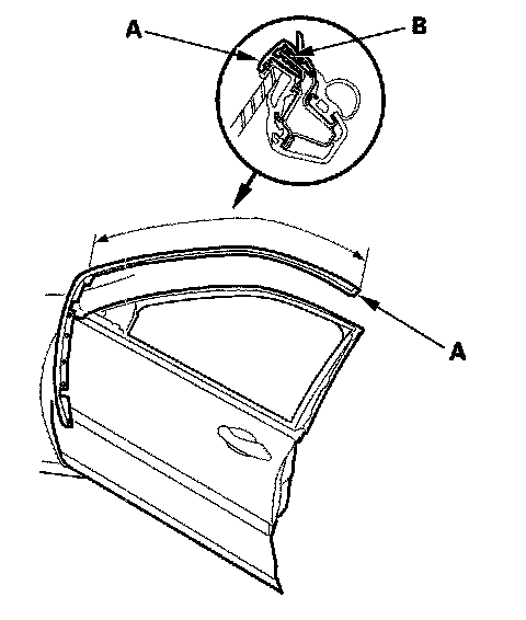 4. Pull the upper subseal (A) away from the upper portion of the door sash flange (B), then remove the subseal.