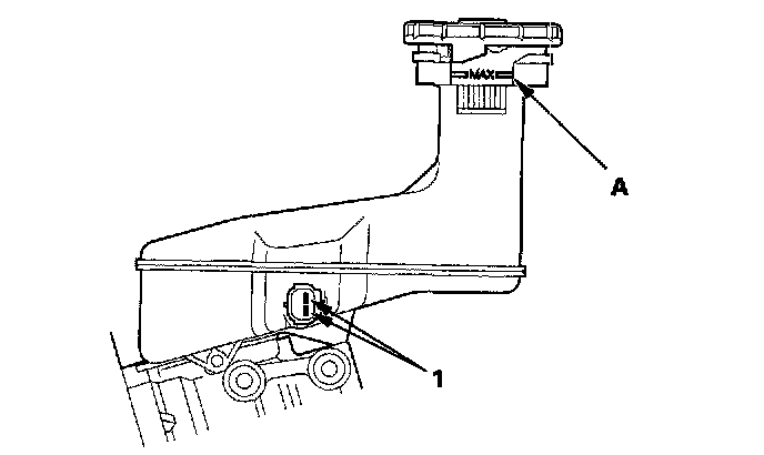 ^ Fill the reservoir with brake fluid to the MAX (upper) level (A). With the float up, there should be no continuity.