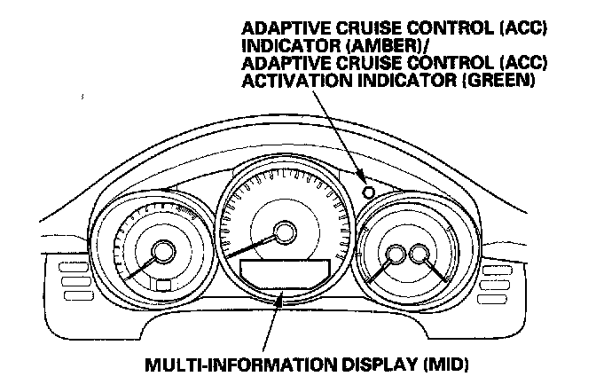 If the adaptive cruise control (ACC) system is normal, the adaptive cruise control (ACC) indicates its operation on the multi-information display (MID) when the adaptive cruise control (ACC) switch is ON.