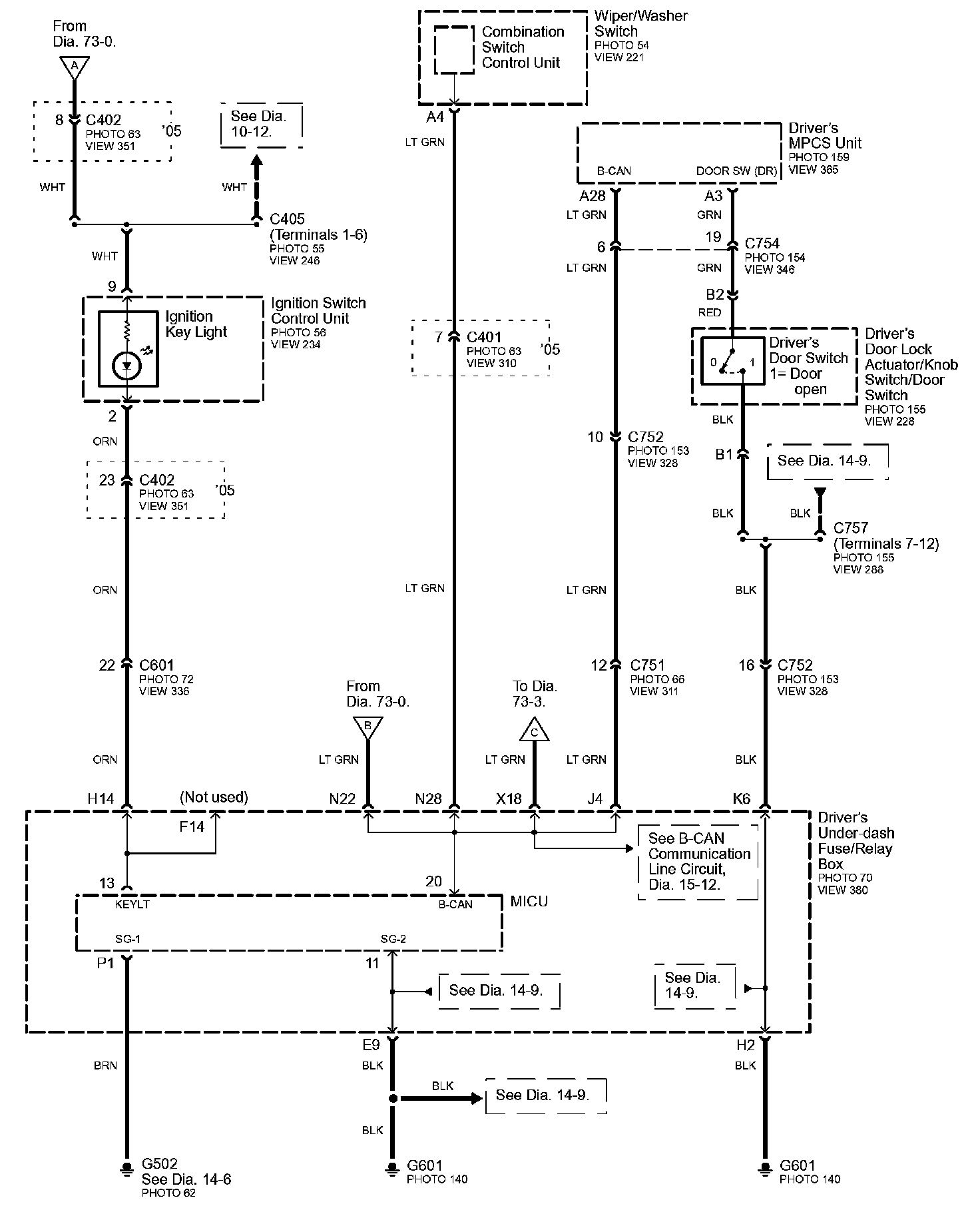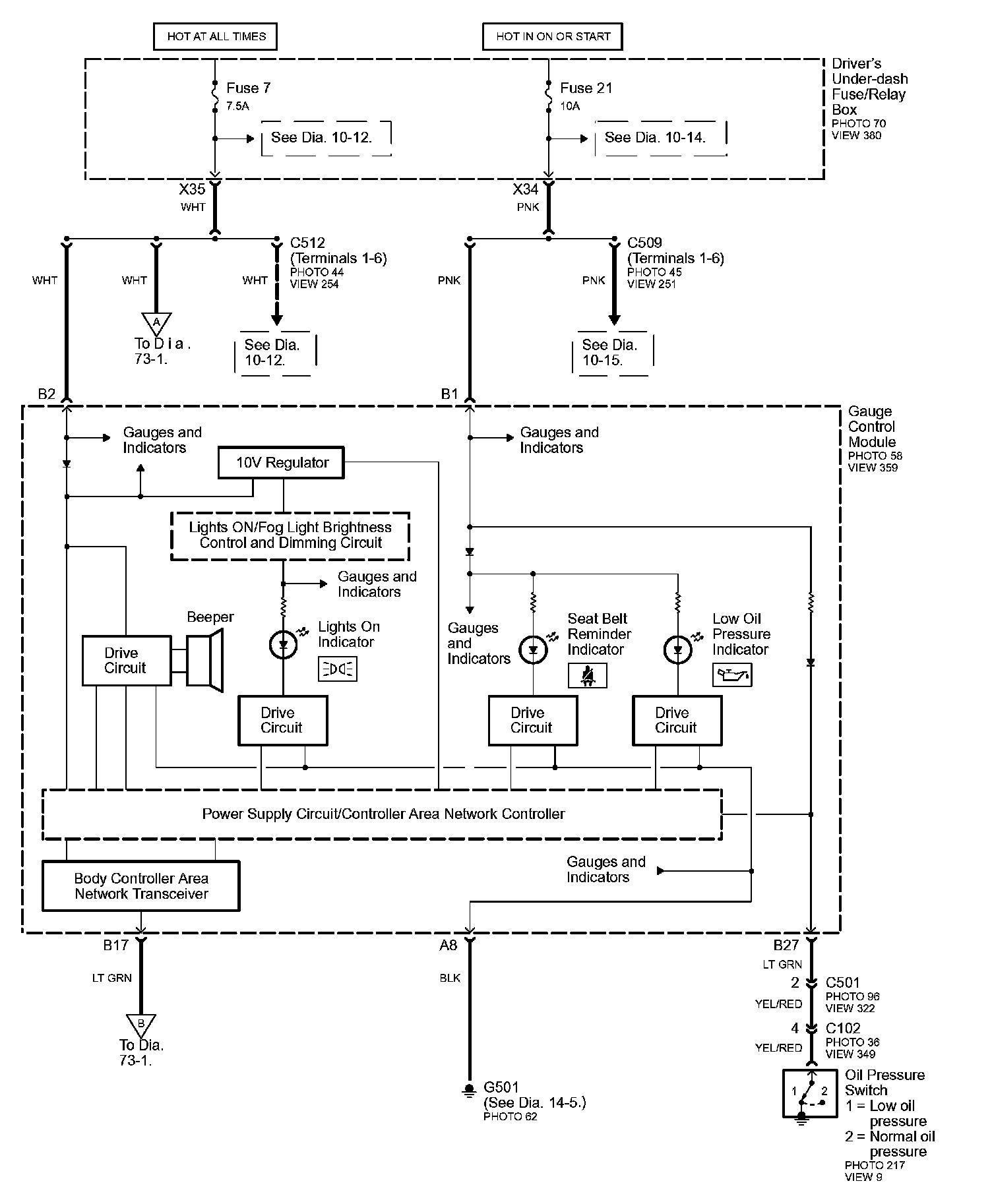 Diagram Set 73 (Reminder Systems, Key Light Timer, and Low Oil Pressure Indicator)