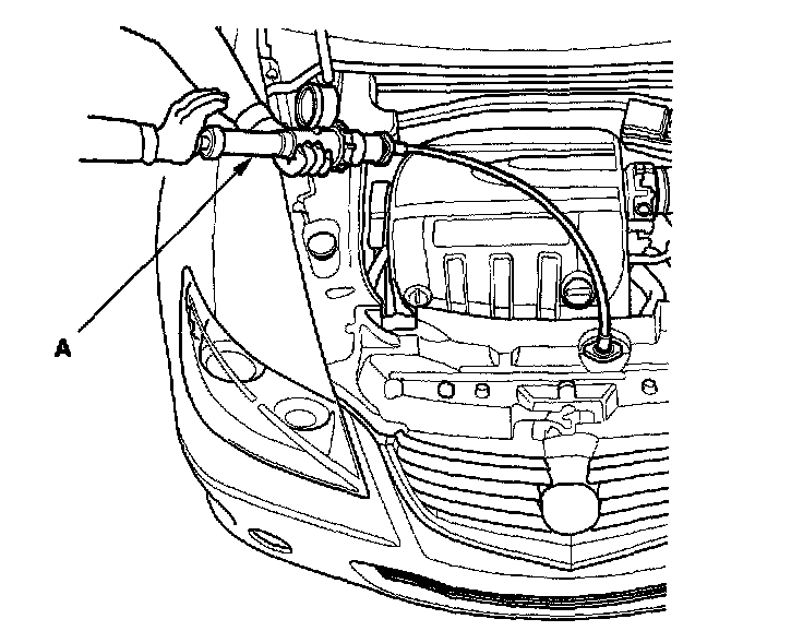 2. Attach a commercially available pressure tester (A) to the radiator, and apply a pressure of 93 - 123 kPa (0.95 - 1.25 kgf/cm2, 14 - 18 psi).