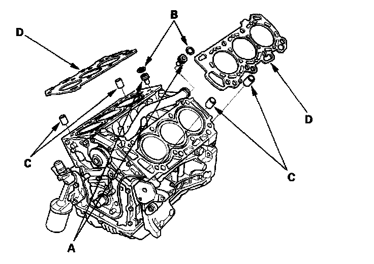 3. Install the dowel pins (C) and new cylinder head gaskets (D).