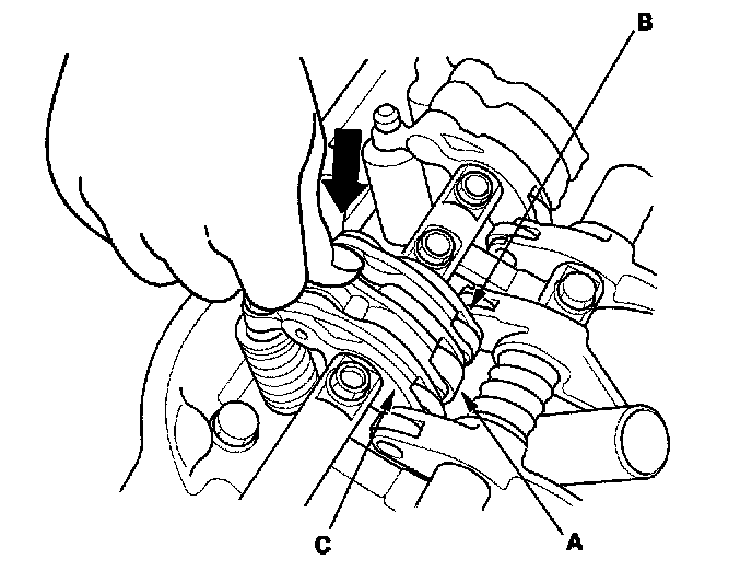 4. Push on the intake mid rocker arm (A) for the No. 1 cylinder. The mid rocker arm should move independently of the primary rocker arm (B) and secondary rocker arm (C).