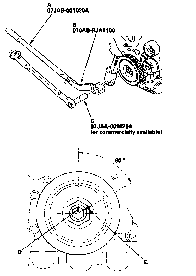 ^ 2 Mark the bolt head (D) and crankshaft pulley (E) as shown, then tighten the bolt an additional 60° (The mark on the bolt head lines up with the mark on the crankshaft pulley).