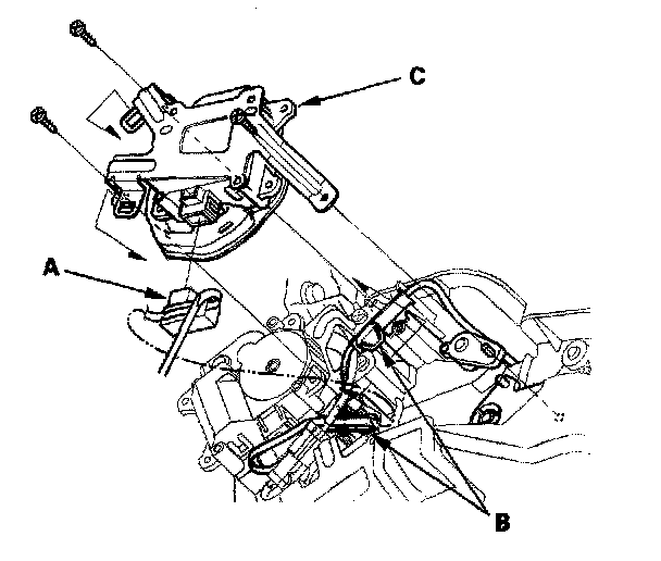 3. Disconnect the 5P connector (A) from the mode control motor. Remove the harness clips (B). Remove the self-tapping screws and the mode control motor (C).