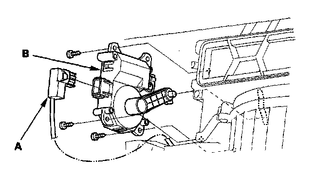 2. Disconnect the 5P connector (A) from the recirculation control motor (B). Remove the self-tapping screws and the recirculation control motor from the blower unit.