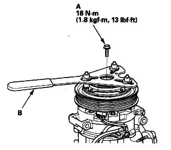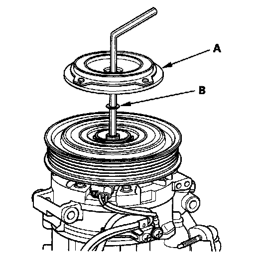 1. Remove the center bolt (A) while holding the pressure plate with a commercially available A/C clutch holder (B).
