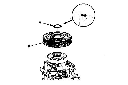 3. If you are replacing the field coil, remove the snap ring (A) with snap ring pliers, then remove the pulley (B). Be careful not to damage the pulley or the A/C compressor.
