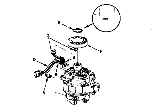 4. Remove the screw from the field coil ground terminal (A), and bracket (B). Disconnect the connectors (C) from the field coil and variable capacity control solenoid valve, then remove the wire harness (D). Remove the snap ring (E), with snap ring pliers, then remove the field coil (F). Be careful not to damage the field coil or the A/C compressor.