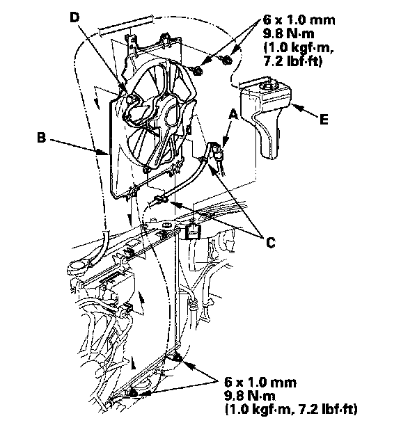 6. Remove the A/C compressor clutch connector (A) from the A/C condenser fan shroud (B). Remove the clips (C). Disconnect the connector (D) from the radiator fan control unit. Loosen the lower mounting bolts, then remove the upper mounting bolts. Detach the reserve tank (E) from the frame. Remove the A/C condenser fan shroud. Be careful not to damage the radiator fins when removing the A/C condenser shroud.