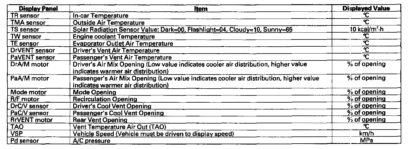 Displaying Sensor Inputs at the Climate Control UnitThe climate control unit has a mode that displays sensor inputs it receives. This mode shows you what the climate control unit it is receiving from each of the sensors, one at a time, and it can help you determine if a sensor is faulty.