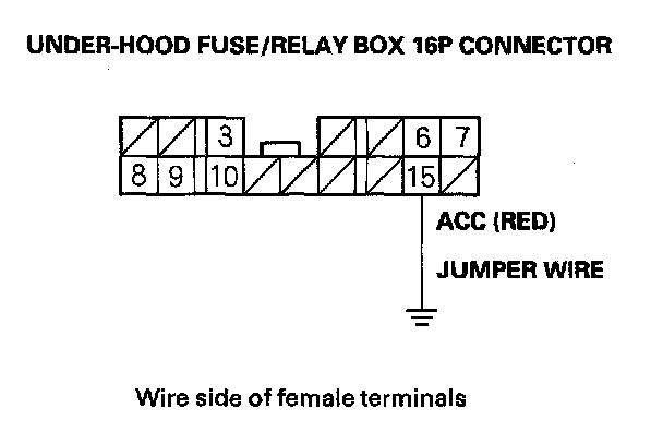 9. Momentarily connect under-hood fuse/relay box 16P connector terminal No. 15 to body ground with a jumper wire several times.
