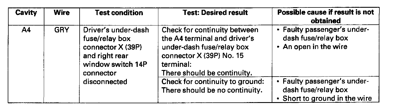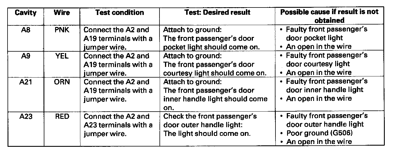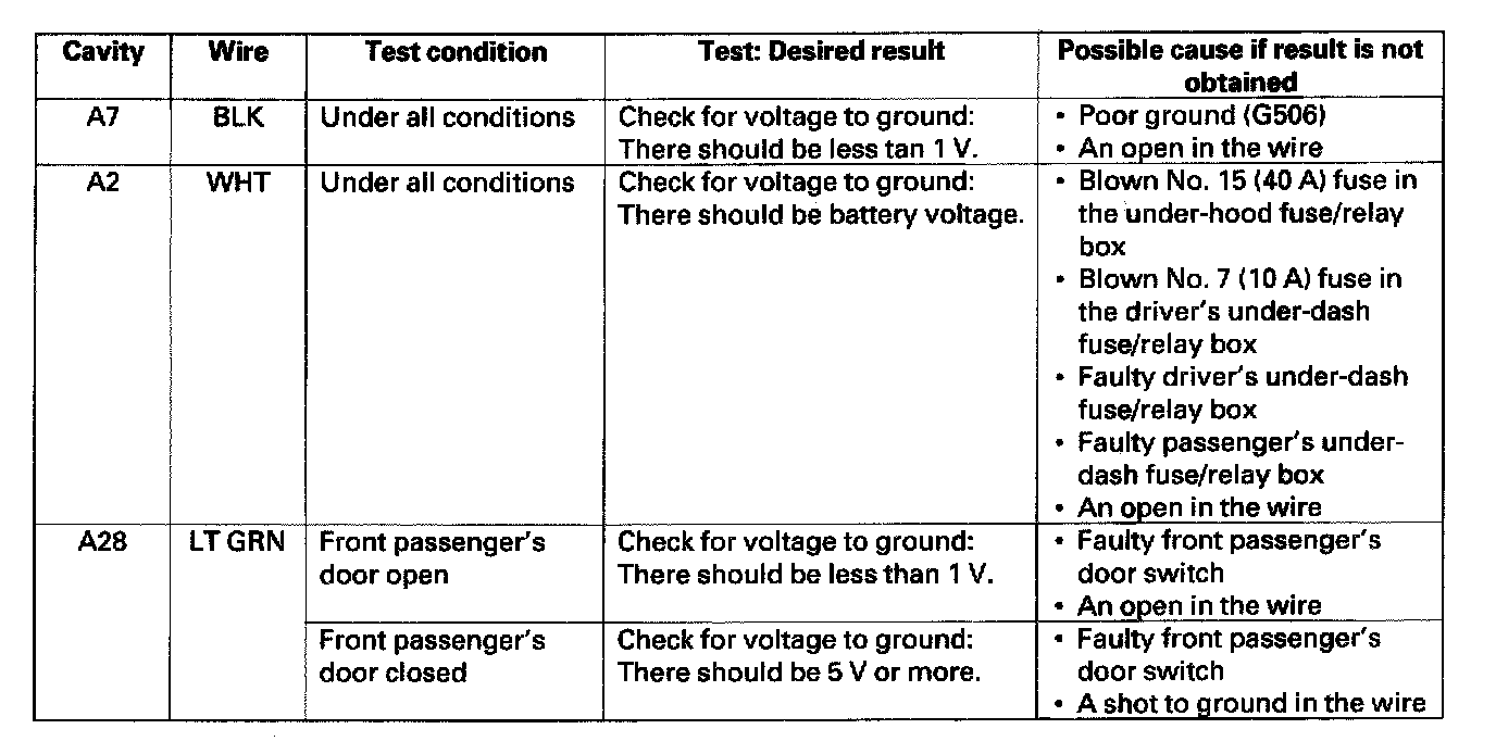 6. Reconnect the connector to the passenger's MPCS unit, and make these input tests at the connector.