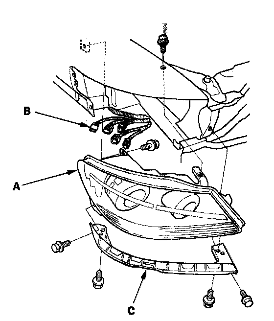 5. Remove the two bolts and the corner upper beam (C) from the headlight.