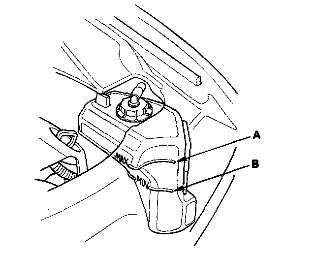 Coolant Check1. Look at the coolant level in the coolant reservoir. Make sure it is between the MAX mark (A) and MIN mark (B).