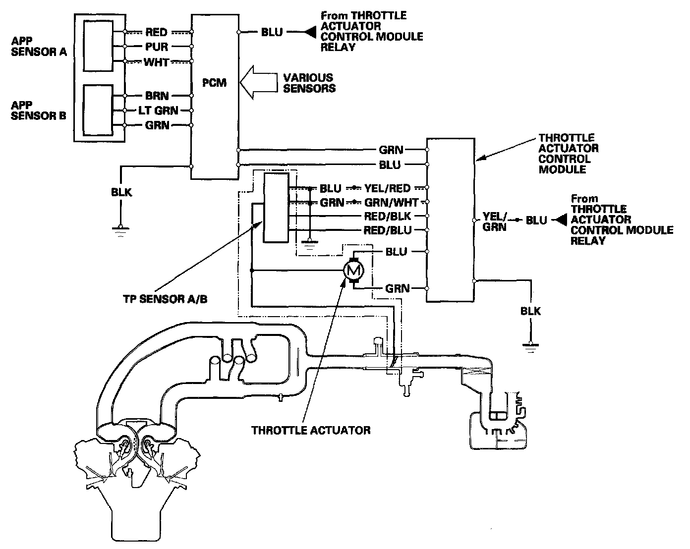 The electronic throttle control system consists of the throttle actuator, throttle position (TP) sensor A/B, accelerator pedal position (APP) sensor A/B, throttle actuator control module, and the PCM.