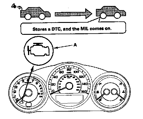 During the third drive cycle after a cold start, if the fuel fill cap is still loose or missing, the PCM stores DTC P0457 "Evaporative Emission (EVAP) System Leak Detected/Fuel Fill Cap Loose or Missing". The malfunction indicator lamp (MIL) (A) comes on, and the "CHECK FUEL CAP" (2005 model) ("TIGHTEN FUEL CAP" (2006 model)) message goes off.
