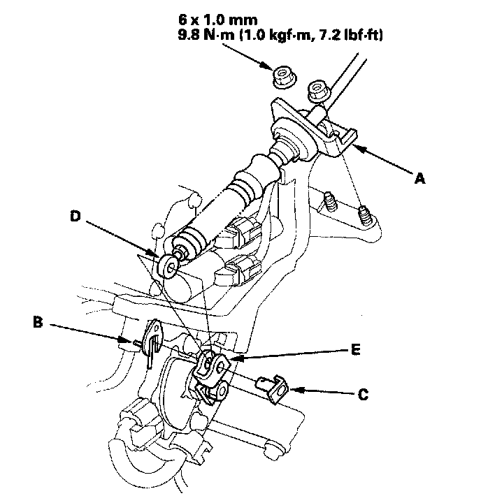14. Remove the spring clip/washer (B) and the control pin (C), then separate the shift cable end (D) from the control lever (E).