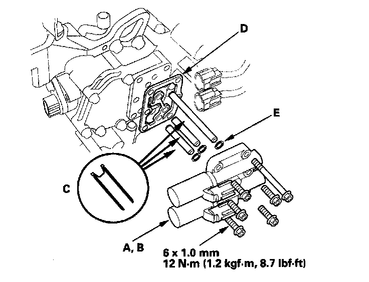 17. Remove the A/T clutch pressure control solenoid valve A and B, ATF pipes (C), gasket (D), and O-rings. (E).