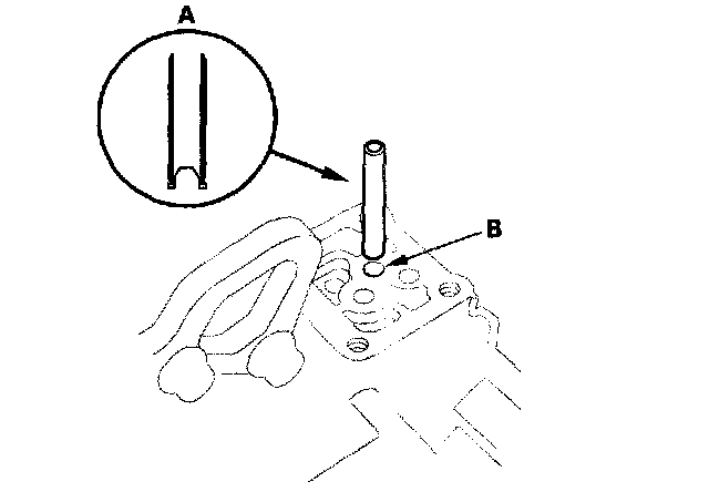 16. Check the height (A) of the 8 x 53 mm ATF joint pipe (B) between the top (C) of the pipe and the solenoid valve body mounting surface (D). The height is about 7 mm (0.3 inch) If the height is over 7 mm (0.3 inch), push the pipe until it bottoms in the accumulator body.