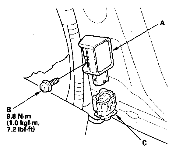 1. Install the new side impact sensor (first) (A) with the Torx bolt (B) then connect the floor wire harness 2P connector (C) to the side impact sensor (first).