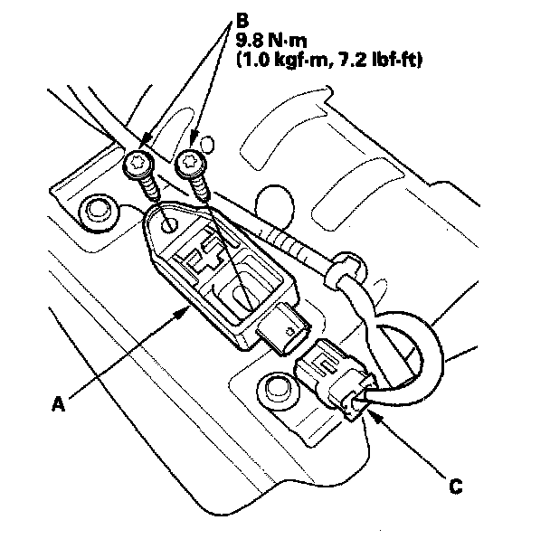 1. Install the new rear sating sensor (A) with the Torx bolts (B) then connect the left side wire harness 2P connector (C) to the rear safing sensor.