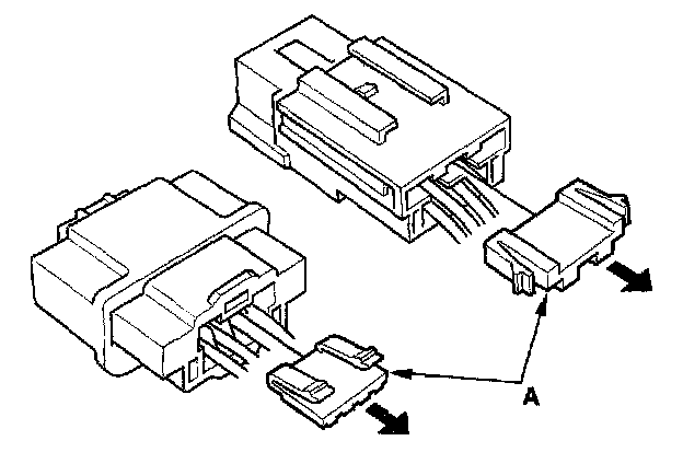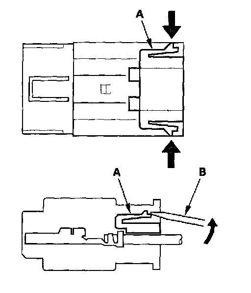 Backprobing Spring-loaded Lock ConnectorsWhen checking voltage or resistance on this type of connector the first time, you must remove the retainer (A) to insert the tester probe from the wire side.