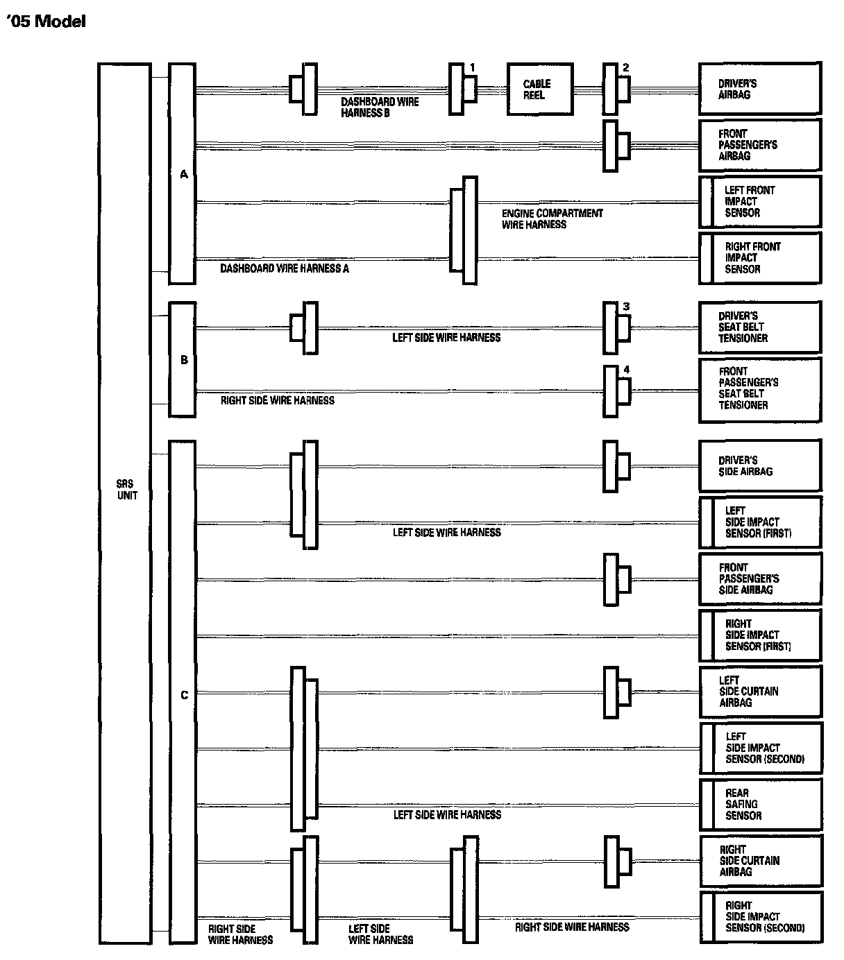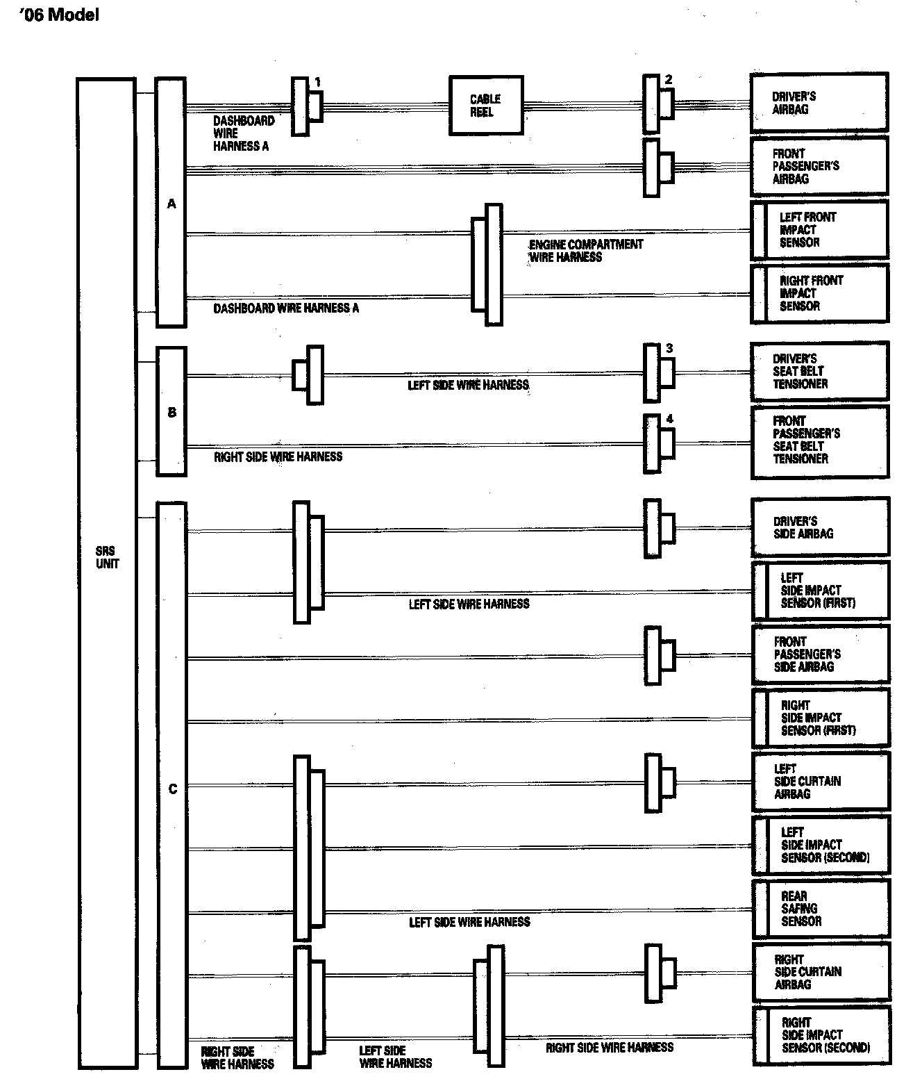 - Before disconnecting SRS unit connector B from SRS unit, disconnect both seat belt tensioner 4P connectors (3, 4).