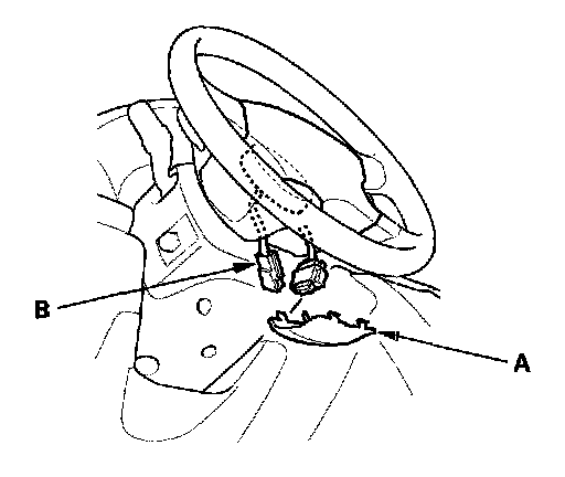 2. Remove the access panel (A) from the steering wheel, then disconnect the driver's airbag 4P connector (B) from the cable reel.