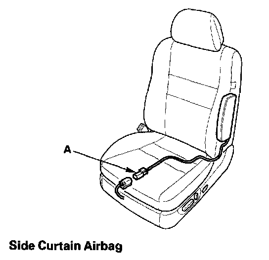 5. Remove the headliner. Disconnect the left or right side wire harness 2P connector (A) from the side curtain airbag.