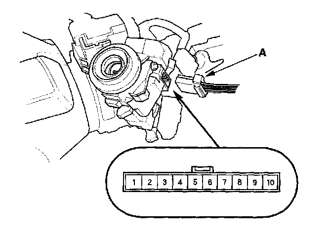 2. Disconnect the 10P connector (A) from the ignition switch control unit.