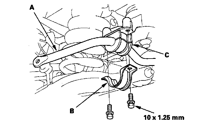 4. Remove the flange bolts and bushing holders (B), then remove the bushing (C) and the stabilizer bar.