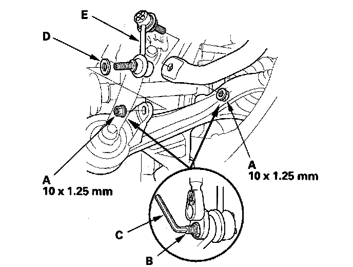 3. Remove the self-locking nuts (A) while holding the respective joint pin (B) with a hex wrench (C), and remove the washer (D) and the stabilizer link (E).