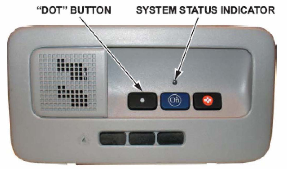 To synchronize the two units, start the engine and press and hold the "dot" button. The system status indicator starts out solid green, then goes to solid red, and then goes back to solid green. This whole process takes about 20 seconds. When the indicator goes back to solid green, the units are synchronized and you can now release the "dot" button and move ahead to the registration process.