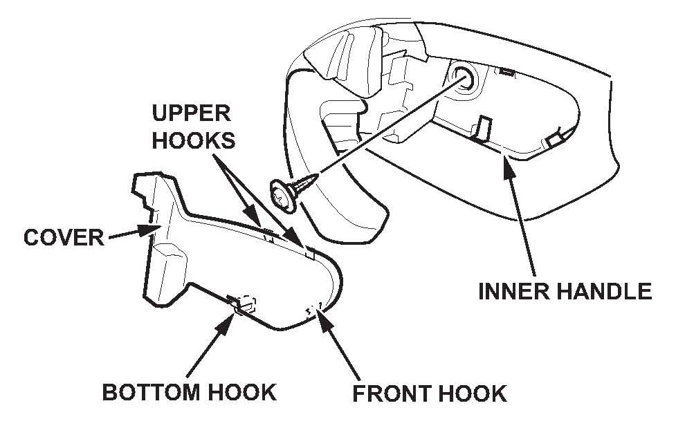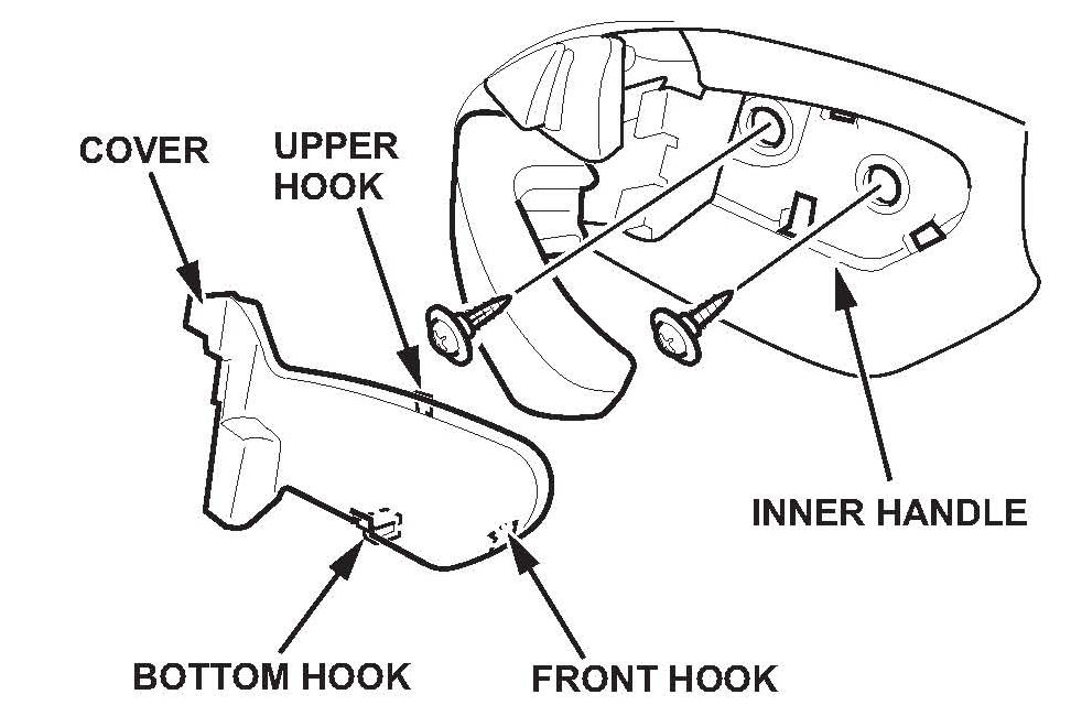 11. Install the rear door outer handle cover in the reverse order of removal, and note these items: