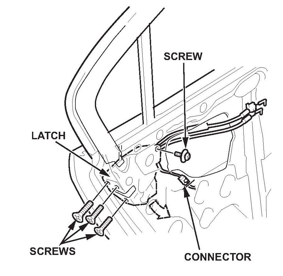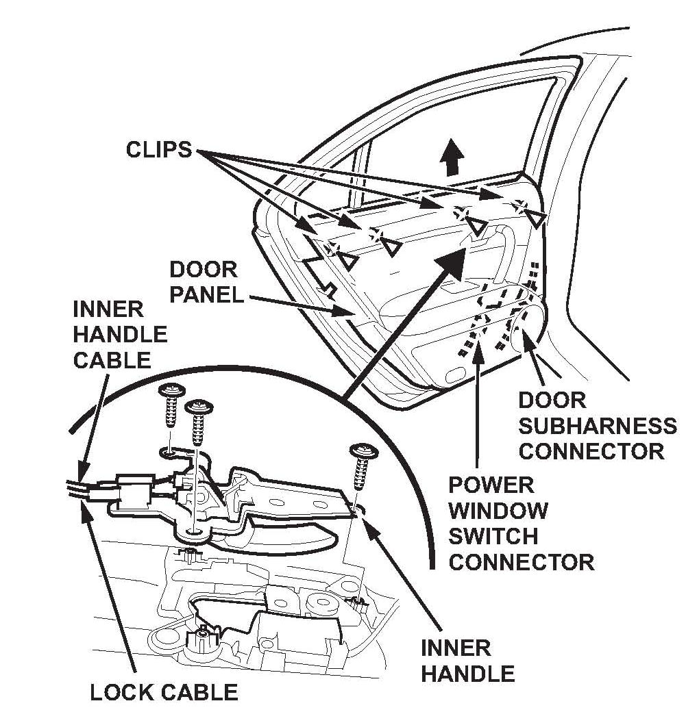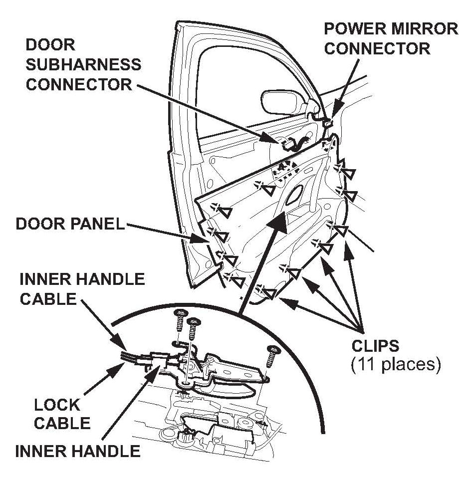 The inner handle cable and the lock cable are connected to the door panel. Do not pull the door panel up too far, or the inner handle cable will be damaged.