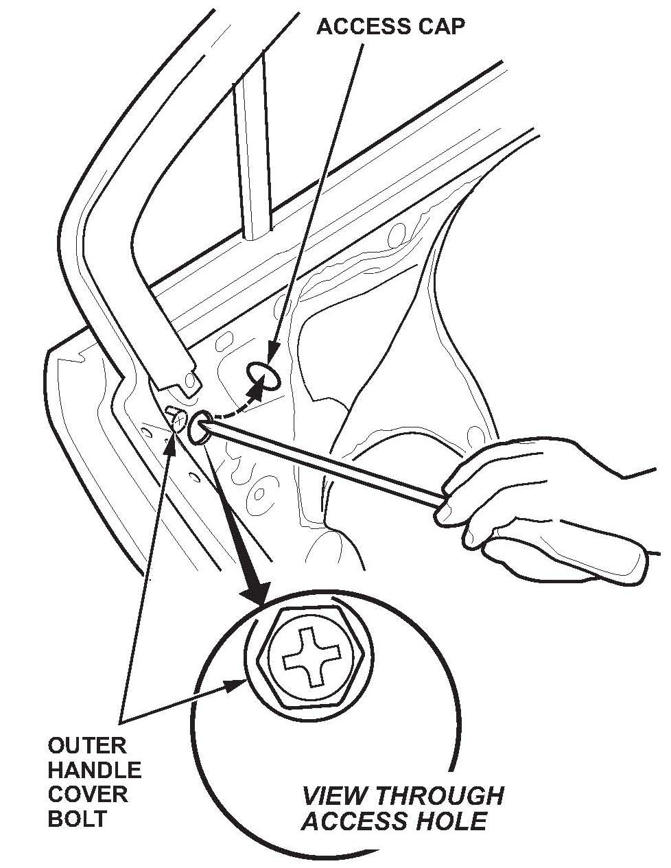 9. Remove the access cap, then push the glass run channel aside, as needed, to insert a Phillips screwdriver or a thin-wall 10 mm socket and extension onto the outer handle cover bolt.