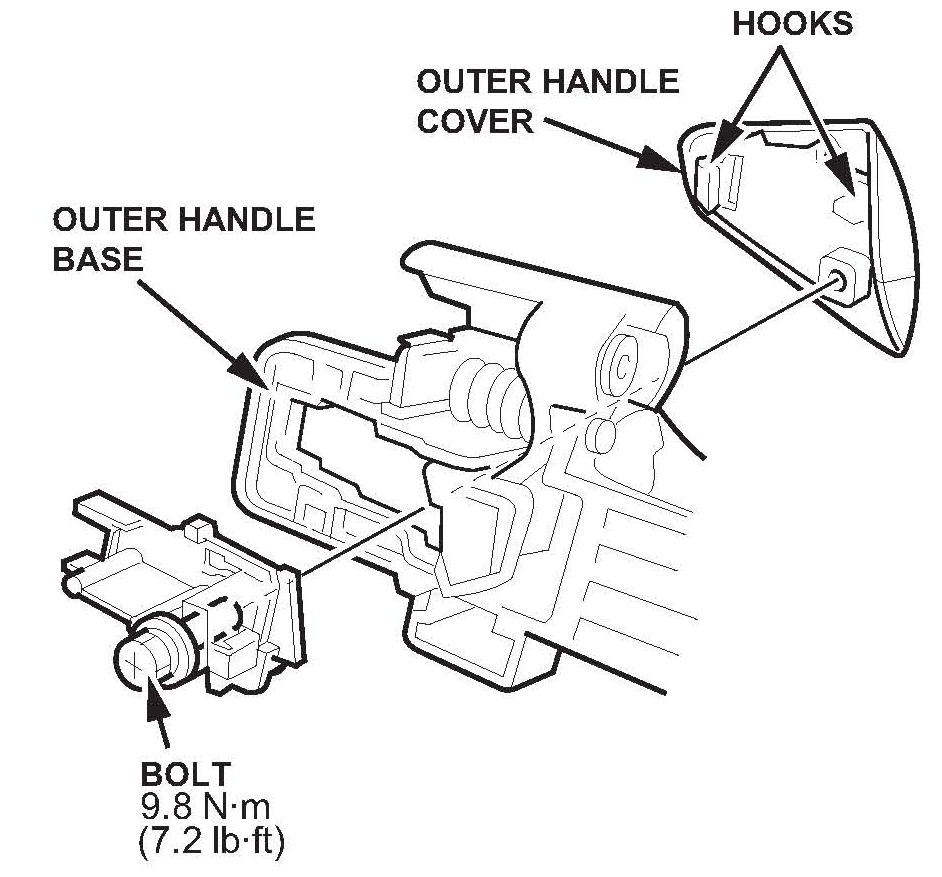 10. While holding the outer handle cover from the outside of the door, loosen the bolt. Pull back on the cover to release its hooks from the outer handle base.