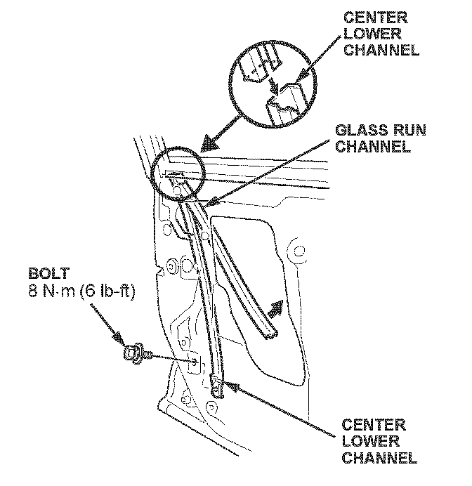 12. Install the center lower channel, put the glass run channel back in place, and torque the bolt to 8 Nm (6 lb-ft).