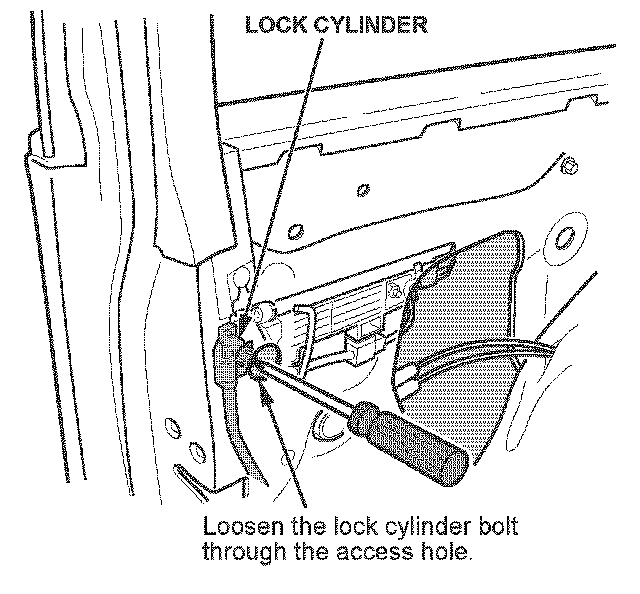 11. Install the lock cylinder and the cover (driver's door), or the outer handle cover to the base (front passenger's door). Torque the bolt to 9.8 Nm (7.2 Lb-ft).
