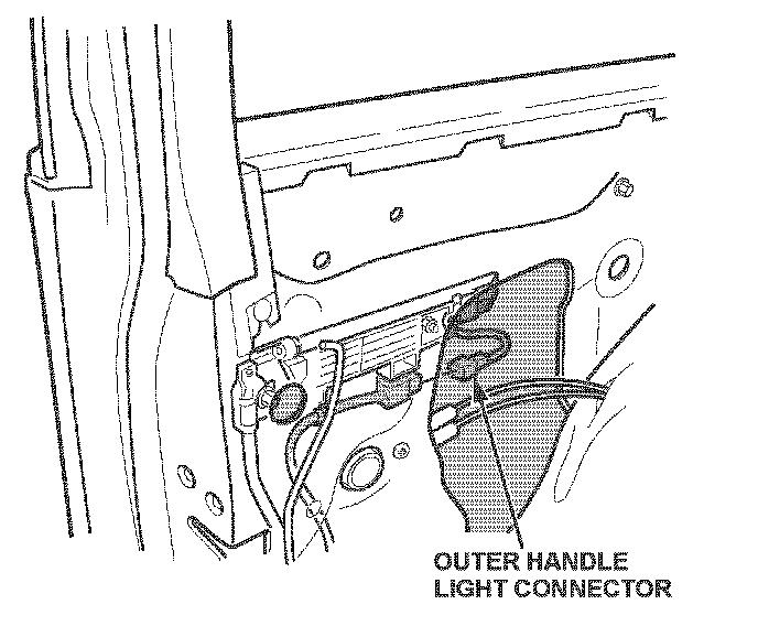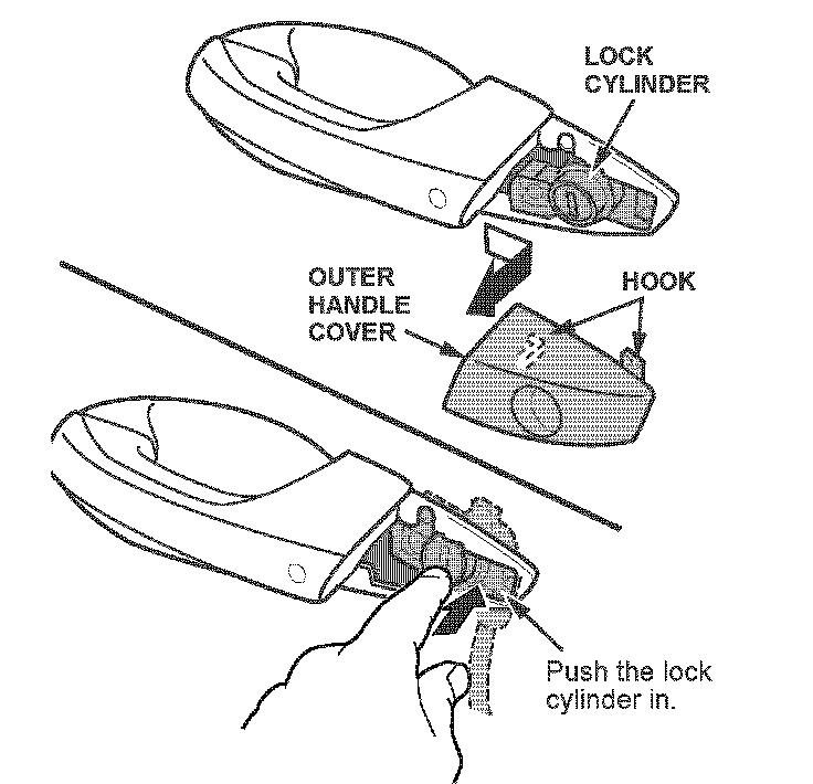 7. Release the hooks of the outer handle cover by pulling it rearward and out to remove the cover. For the driver's door, push the lock cylinder back towards the inside of the door.