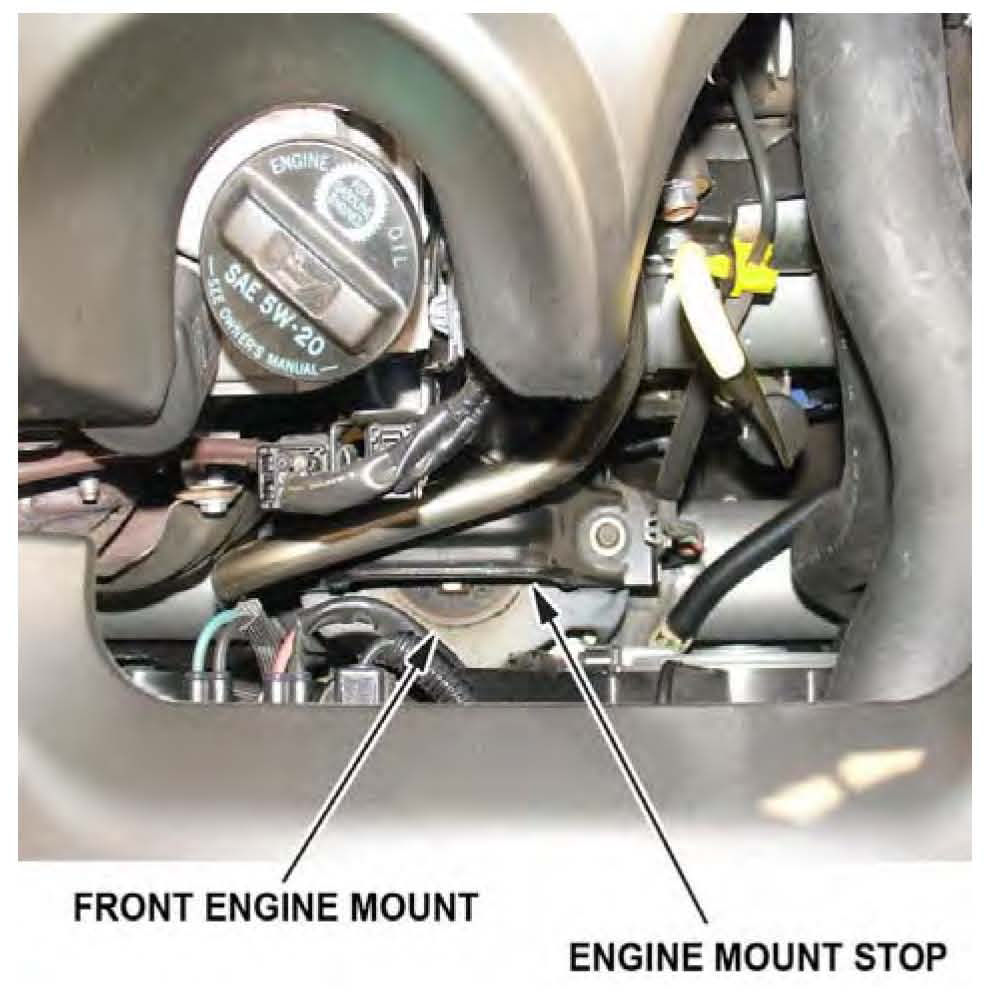 3. Look for contact or listen for a knock between the top of the front engine mount and the bottom of the front engine mount stop.
