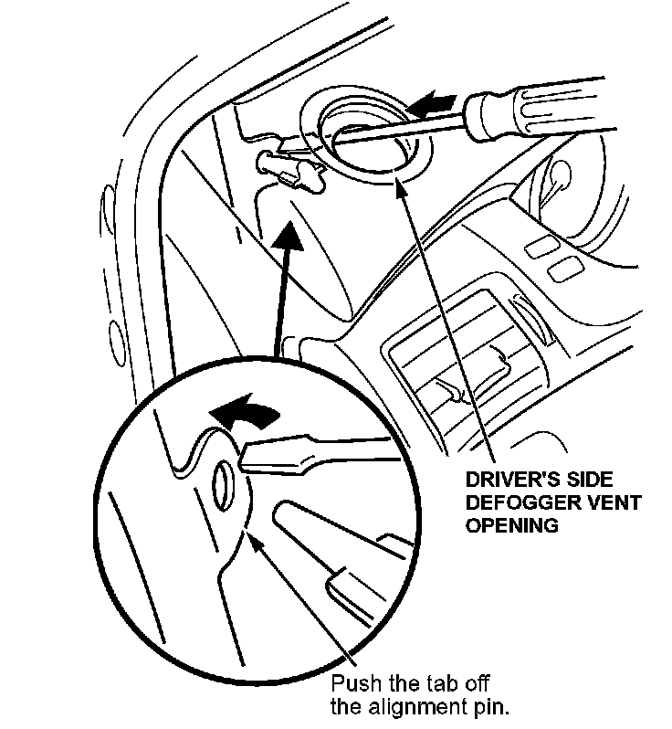 9. Use a flat-tip screwdriver to bend and push the metal tab off of the alignment pin behind the driver's side defogger vent trim. If needed, use a hammer to lightly tap the screwdriver.