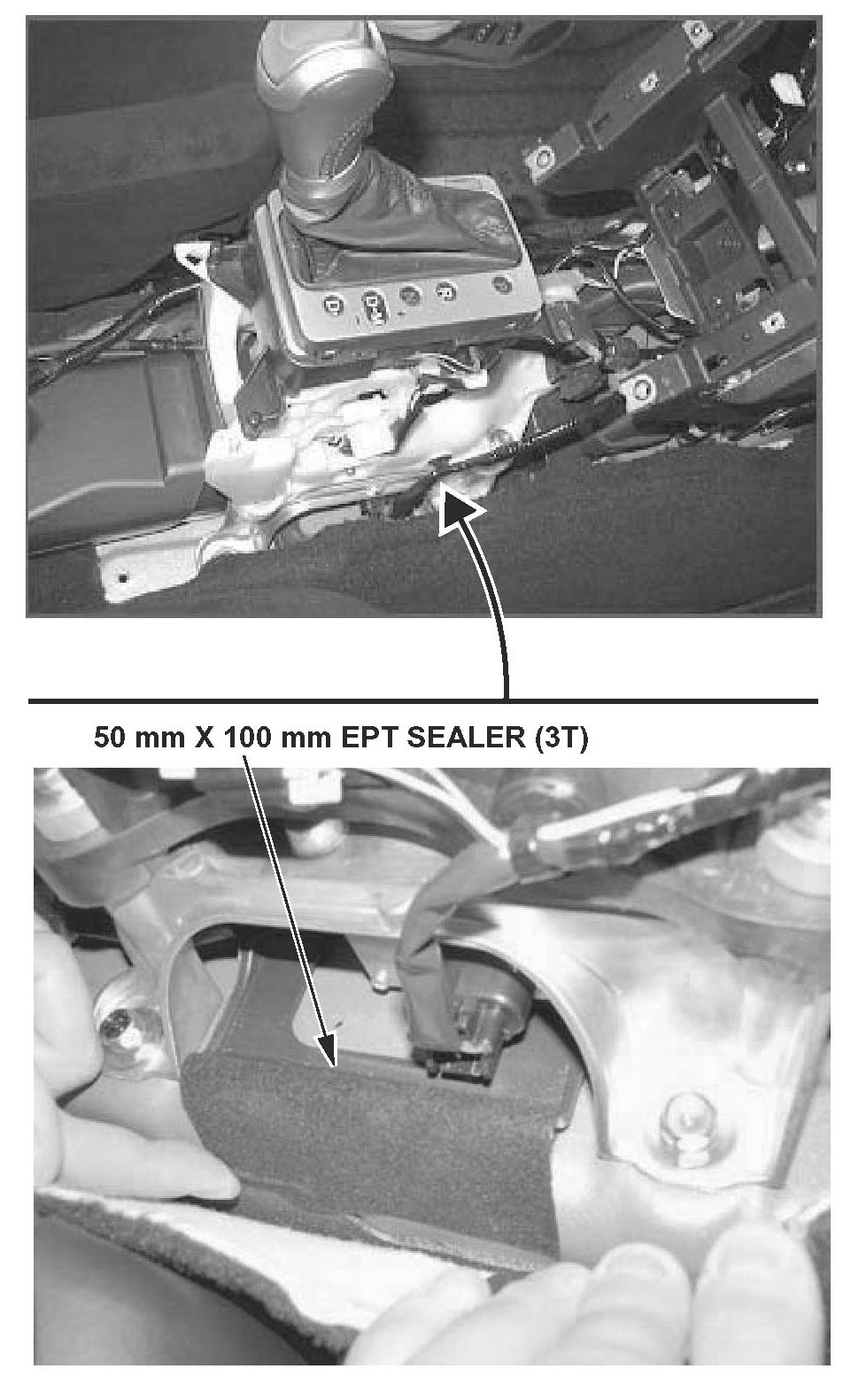 26. Cut one 50 mm x 100 mm piece of EPT sealer (31), remove the adhesive backing, then pull back the carpet on the right side of the shift lever, and apply the felt to the plastic shield.