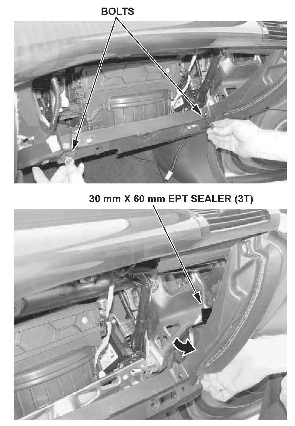 34. Cut one 30 mm x 60 mm piece of EPT sealer (31), and remove the adhesive backing. Pull out the lower-right corner of the dashboard, and apply the sealer to the dashboard frame.