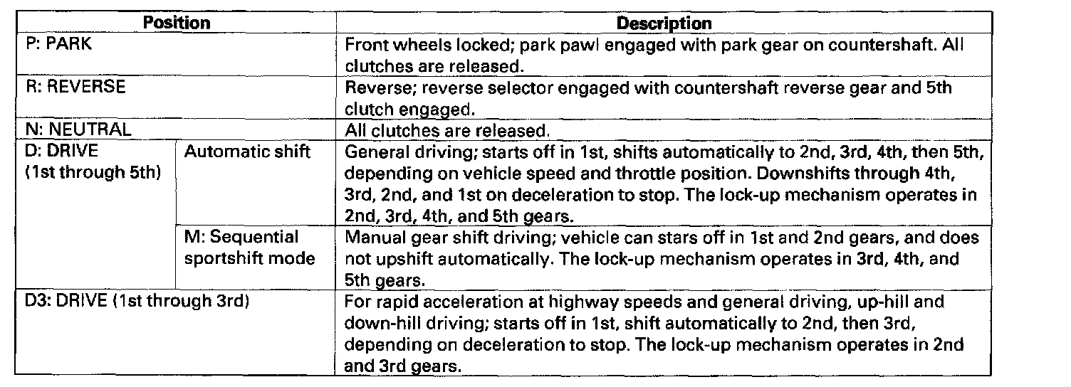The shift lever has five positions; P: PARK, R: REVERSE, N: NEUTRAL, D: DRIVE 1st through 5th gear range with automatic shift and sequential sportshift in M (Sequential sportshift mode) position, and D3: DRIVE 1st through 3rd gear range with automatic shift.