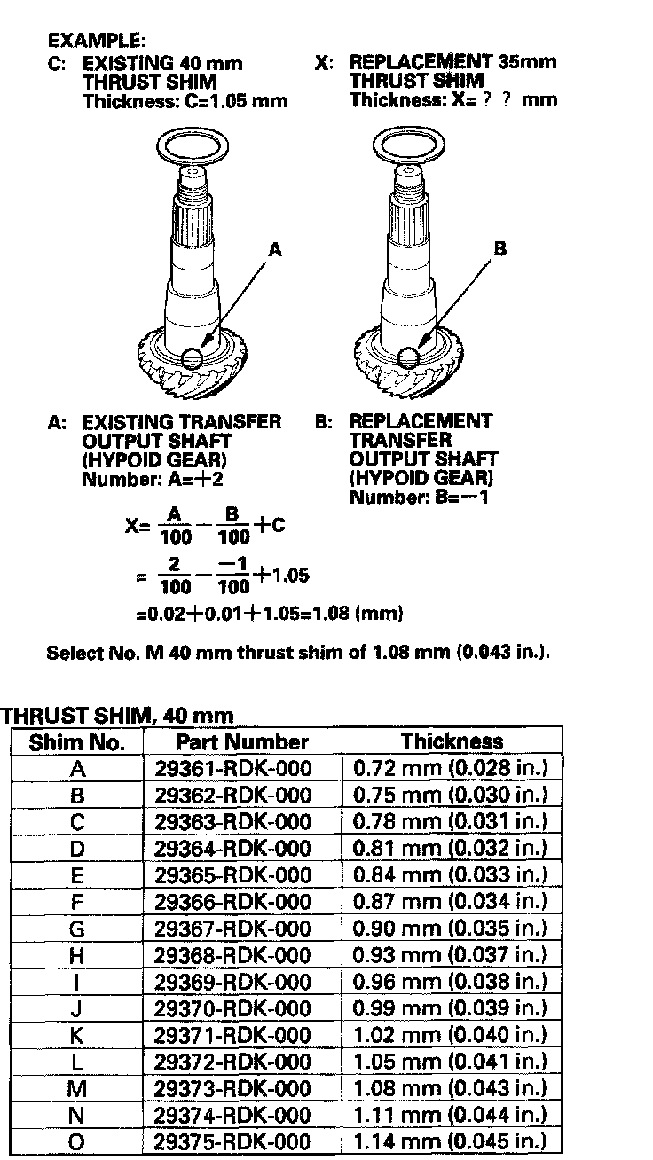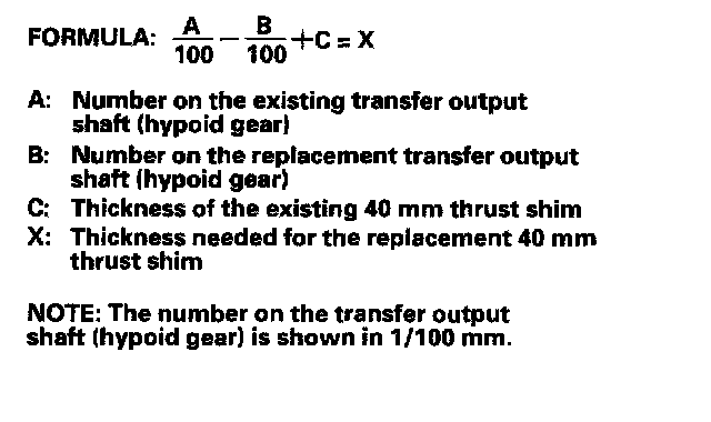 1. Select the 40 mm thrust shim if the transfer output shaft (hypoid gear) is replaced. Calculate the thickness of the 40 mm thrust shim using the formula below, and select the shim from the following table.