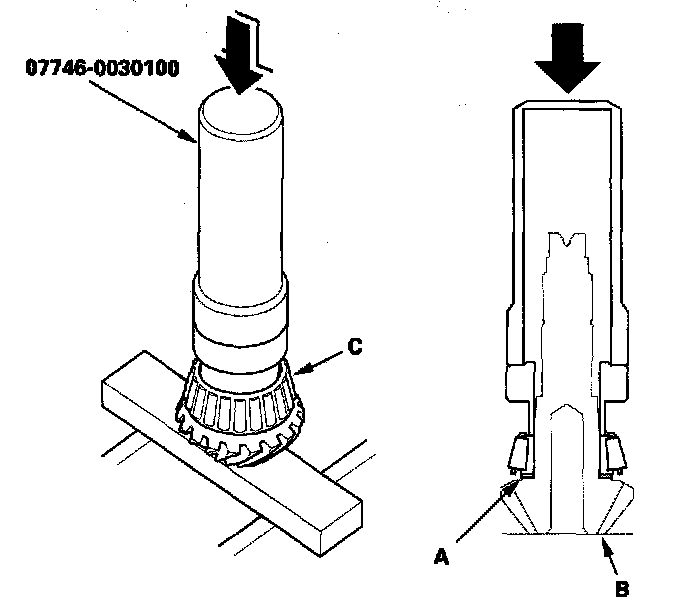 3. Install the 40 mm thrust shim (A) on the transfer output shaft (hypoid gear) (B), then install the tapered roller bearing (C) with the special tool and a press.