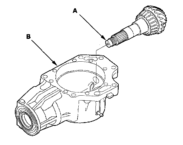 6. Install the transfer output shaft (hypoid gear) (A) in the transfer housing (B). Do not install the thrust washer and transfer spacer on the transfer output shaft.